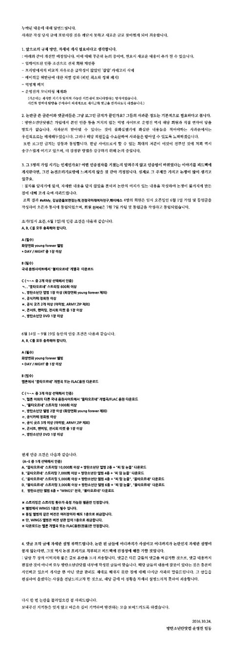 덧붙여, 방탄소년단닷컴 (이하 방닷)에서 공개한 글을 작성한 회원들은 현재와 달리 등업조건이 낮았던 홈 임시오픈일 날 가입한 회원들임이 확인된 것은 사실입니다. 그러나 등업조건이 낮았다 하여 이들이 흔히 지칭하는 '어그로', '팬코' 혹은 '라이트'라 확신지을 수 없으며, 혹여나 그렇다 하더라도 절대로 이와 같은 행동을 정당화할 수 없다는 사실을 정확히 숙지하고 있습니다. 따라서 저희는 그들과 같은 아미로서 그들이 했던 행동에 대해 변명의 여지가 없음을 알고 깊이 반성하고 있습니다. 상처받으신 타 팬덤 여러분께 죄송하다는 말씀 감히 또 드리고 싶습니다