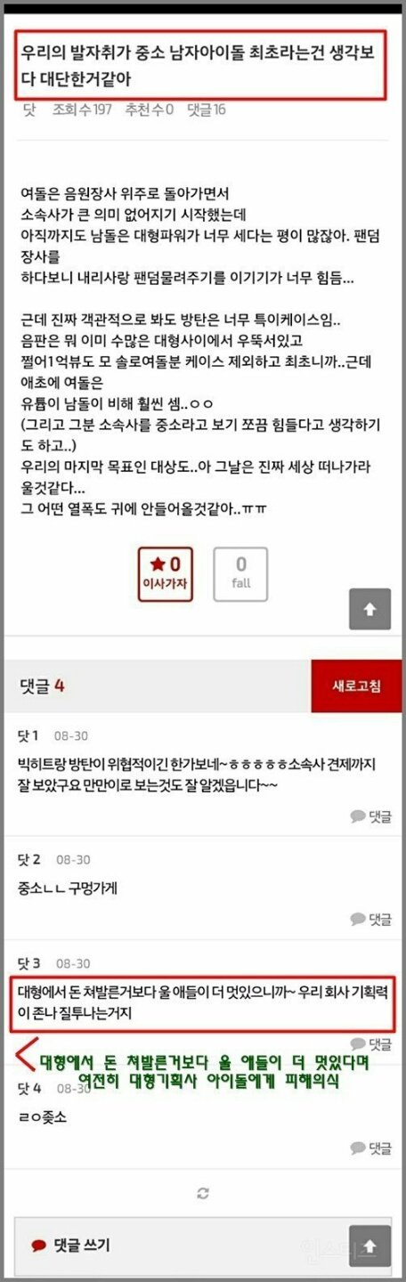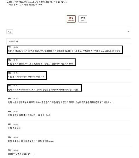 현재 방탄소년단닷컴 홈에는 방탄소년단닷컴 공식 피드백과 글 작성자들의 사과문이 올라와 있는 상태이며, 해당 글이 올라온 게시판은 폐쇄된 상태입니다.