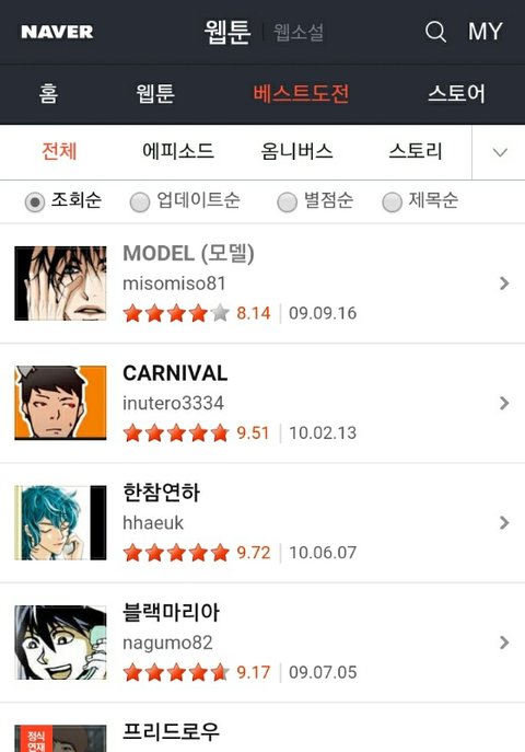 수정) 원래는 정식연재된 웹툰은 인기순위에서 내려가서 걸어서 30분 그림그리기 좋은날 이런순서로 나오는데 갑자기 저렇게 옛날거만 뜬다구