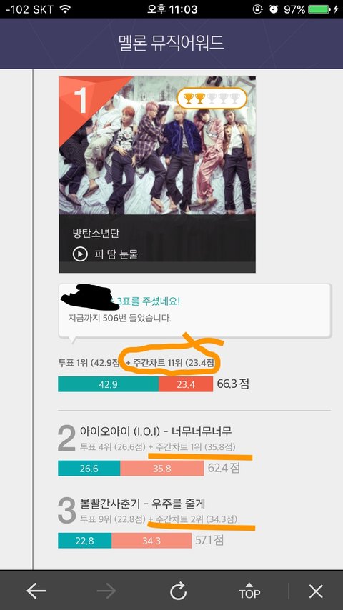 지금 주간 인기상도 팬덤이 세니깐 투표수 많아서