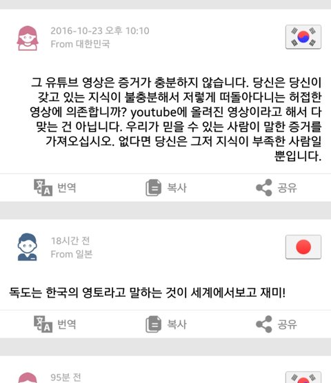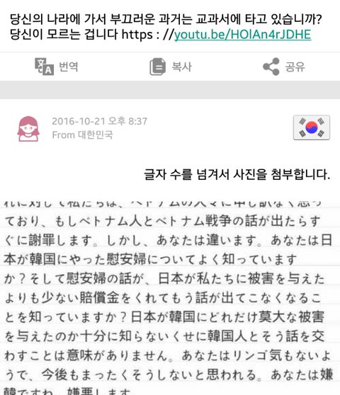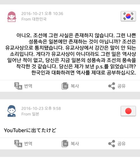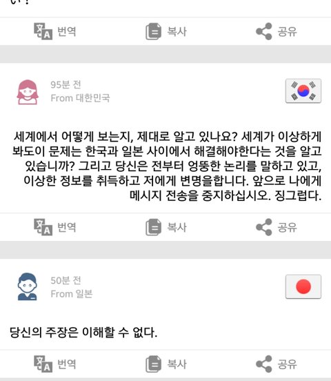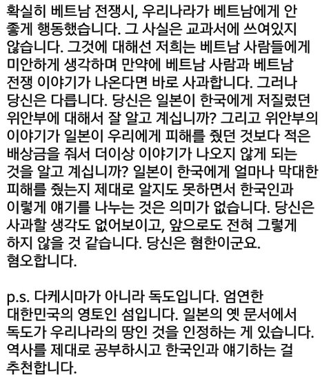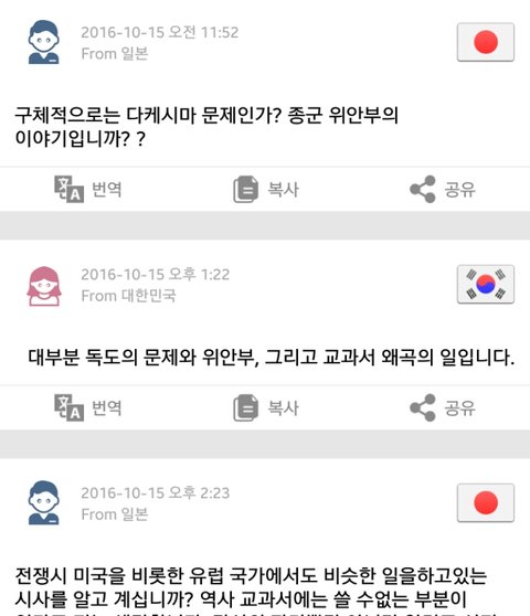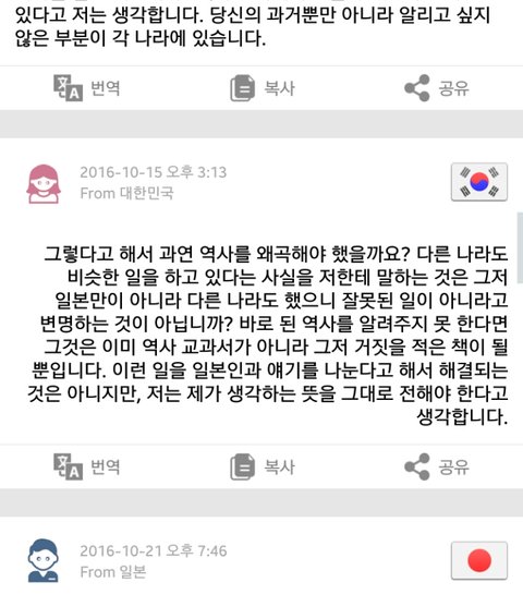 처음에는 그냥 평범한 이야기 주고받다가 어쩌다 역사 이야기가 나왔는데 이 사람이 일본에 대해 싫은 점을 묻는거야. 그래서 교과서와 일본군 위안부, 독도 문제라고 답했어 (사진은 자동번역 된거야!)