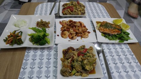ㅎㅎㅎ마트다녀온 다음날이라 뭔가 푸짐했어요!ㅎㅎ연어는 올리브유에 레몬 후추뿌려서 구워주구요, 새우는 해동해서 버터에 다진마늘넣고 구워줬어요! 밥은 소고기덮밥인데ㅎㅎ불고기 간을 좀 쎄게해서 계란 풀어서 휘릭해서 먹으면 맛있어요!ㅎ