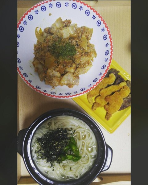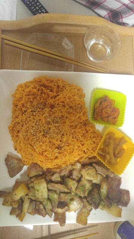 이날 마트갔다가 용가리 세일하길래ㅎㅎ얼른 집어왔어요!옛날생각이나서요ㅎㅎㅎ 멸치육수에 칼국수면 넣구요, 김이랑 매운고추 썰어넣구 먹었어요!!밥은 굴소스넣고 남은 목살넣어 볶았어요!
