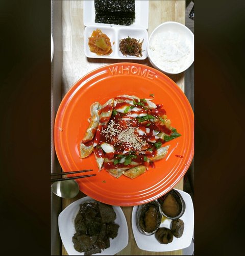 ㅎㅎ각자 좋아하는것만 있네요! 남편 좋아하는 만두튀기고 냉장고에 있던 야채 썰어서 비빔만두하구요, 저는 소고기 꾸웠어요! 옆에는 아빠가 보내주신 전복장이에용!