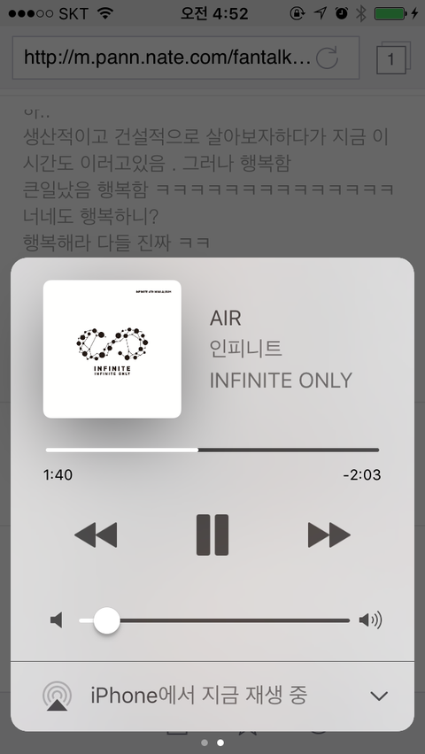업무시간 동안 접하지 못한 팬톡. 짹. 인별파기가 시작됨. 인스타와 트위터 계정을 판 이유가 인피니트임. 인피니트 관련된 여러고마운 수니들을 팔로우 해놓고 하나씩 하나씩 보고 좋아요 누르고 댕김. 마무리는 너튜브^^