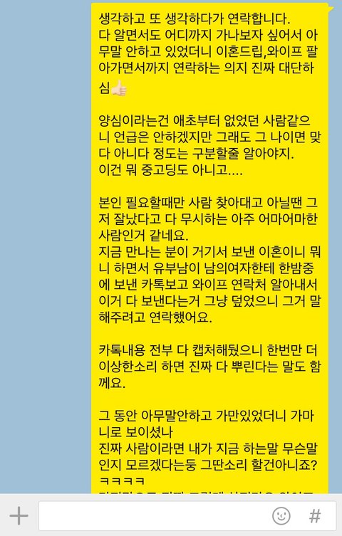 그거 계속 쌩까다가 며칠전인가...자기 이번에 이혼한다면서 또 연락이 왔더라구요.