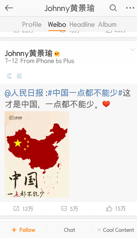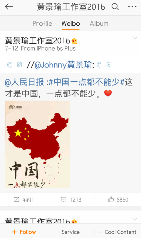 <황징위가 본인 웨이보에 올린 남중국해 지지 글>