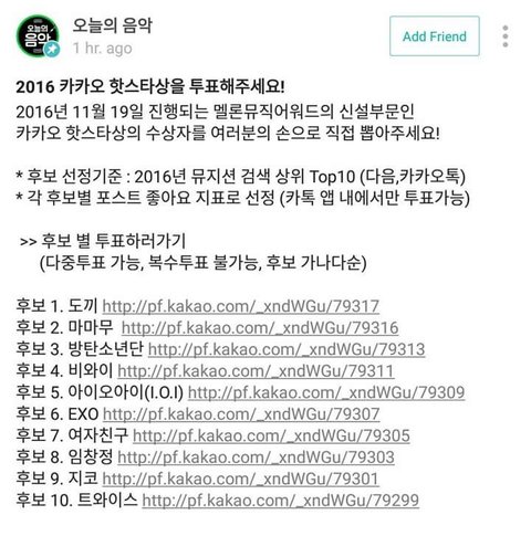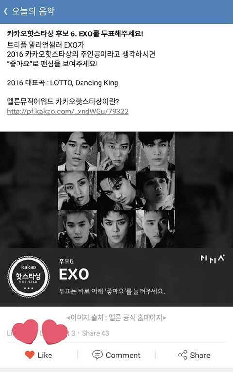 카오핫스타상 엑소 좋아요 눌러ㄱㄱ