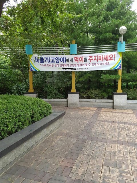 그런데 현수막이 걸린 후로 거기에 고양이 캔을 하나 놓아주고 오면 누가 바로 뒤 따라와서 치워버린답니다. 그래서 여러 번 마찰과 다툼이 있었습니다. 아이들도 아니고 나이도 아주 많은 분들이 이게 무슨 짓이랍니까? 어떤 분은 공공연히 고양이와 비둘기들을 총으로 다 쏴 죽여버리겠다고 공언하기도 합니다 (실제로 집에 총이 있는 지는 모르겠지만). 물론 고양이를 싫어하시는 분들도 나름대로 이유가 있는 것을 압니다.