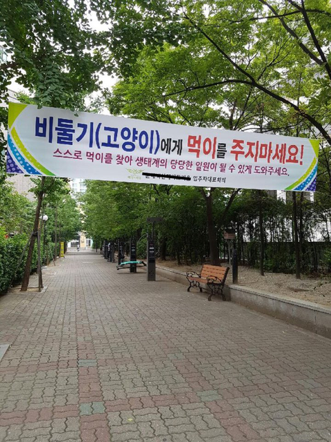 현수막이 걸린 후 여러 건의 마찰이 있어서 입주자 대표회의와 관리소에 여러 번 현수막 철거를 부탁했지만 전혀 말이 통하지 않고 안하무인으로 무시하고 묵살합니다. 항상 내세우는 이유는 고양이가 외제차에 기스를 내기 때문에 없애야 한답니다. 여러분들도 저 플래카드에 써있는 글처럼 도시의 그늘에서 태어난 고양이들이 ‘스스로 먹이를 찾아 당당한 생태계의 일원으로 돌아갈 수 있다’고 생각하시나요? 그들이 돌아갈 생태계가 있나요? 저희는 기왕 태어난 불쌍한 생명들이 두려움과 배고픔에 떨지 않고 고통 없이 살다 가기만 희망합니다. 길고양이들은 집고양이들과 달리 2-3 년밖에 못산다고 합니다.