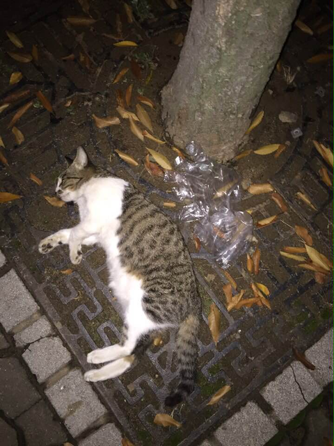 얼마 전에 분명히 머리가 짓밟힌 것으로 보이는 비둘기의 시체가 발견되었고, 엊그제 (10월 26일)에는 밥을 먹으러 왔던 어린 고양이 한 마리가 살해되었습니다. 저녁 때 밥을 주신 분이 잘 아는 고양이었는데 잠시 후 다시 가보니 그 자리에 목이 졸려 죽은 것으로 보이는 고양이 시체가 있었고, 더욱 섬뜩한 것은 사진에 보시다시피 범행에 사용한 비닐 장갑이 곁에 놓여 있었습니다.