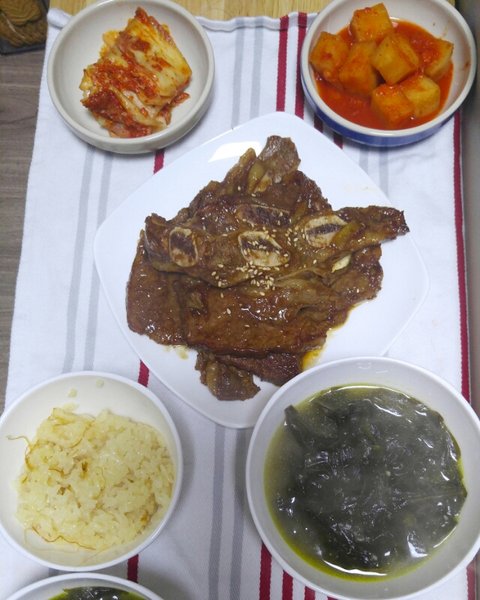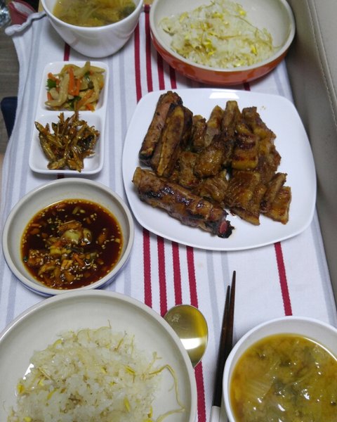 이거는 정말 제가 다 한거네요ㅎㅎㅎ콩나물밥에 배추된장국! 명치고추장볶음 어묵볶음! 양념갈비에요! 집에서 한게 맛있긴해요ㅎㅎ
