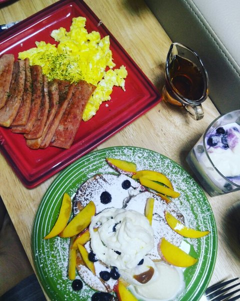 이것도 쉬는날 브런치에요! 스팸 얇게 썰어 굽고 스크램블이란 핫케잌했어요! 그릭요거트 플레인에 냉동블루베리랑 메이플시럽 뿌려먹으면 맛있어요!
