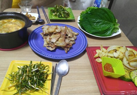 회사끝나고 남편 퇴근이 늦어서 근처 마트에 들어갔는데 대패삼겹살 세일하길래 집어왔어요! 고기는 만원안했는데...파채랑 쌈랴채사니 고기값보다 더나왔어요...;;ㅎㅎ그래도 맛있었습니다!ㅎ