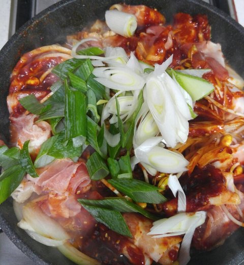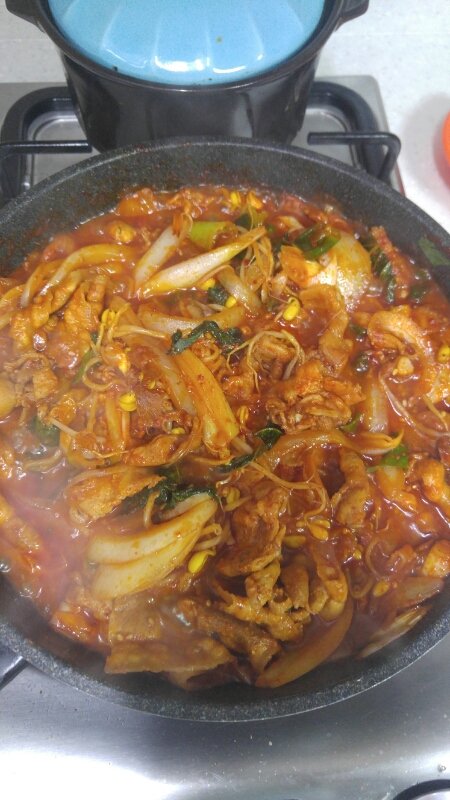 ㅎㅎ콩불이에요...ㅎㅎㅎㅎ위에 콩나물 밥하고 남은 콩나물이랑 대패삼겹살 남은걸로 만들었어요! 양념은 고추장3 고춧가루3 미림3 들깨 다진마늘1 참기름 후추조금 널고 양파랑 당근 콩나물 넣고 볶다가 깻잎짤라 넣어주면 끝입니당!