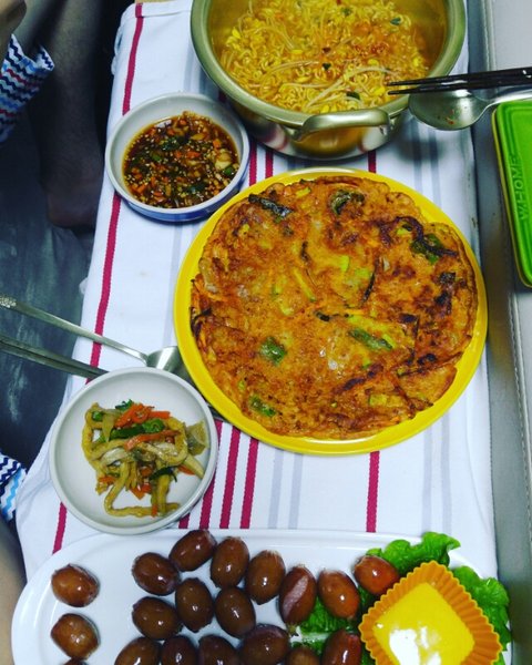 제주는 요며칠 비가 내렸답니다...ㅎㅎ그래서 김치전에 해장라면! 신라면인데요, 스프는 반만널고 물은 넉넉히 콩나물 넣고 새우젓으로 간하구요, 고춧가루조금 대파랑 청양고추 썰어서 먹었어요! 소주를 부르는맛입니다..ㅎㅎ