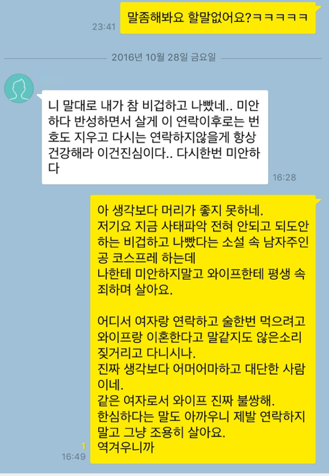 카톡보고나서도 답장도 없길래 그날밤에 한번 더 비꼬아봤어요 솔직히 진짜 빅엿 먹이고 싶었거든요.