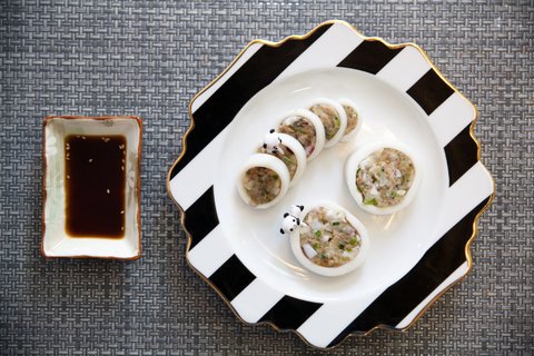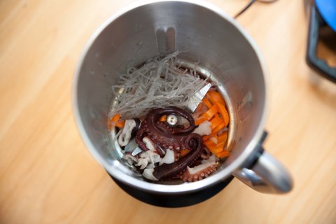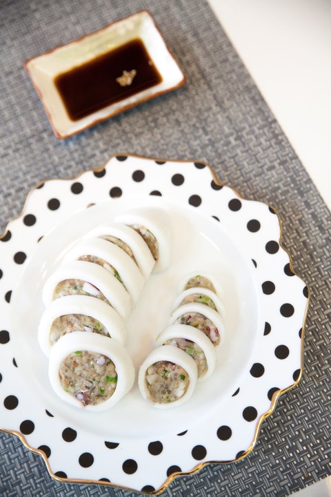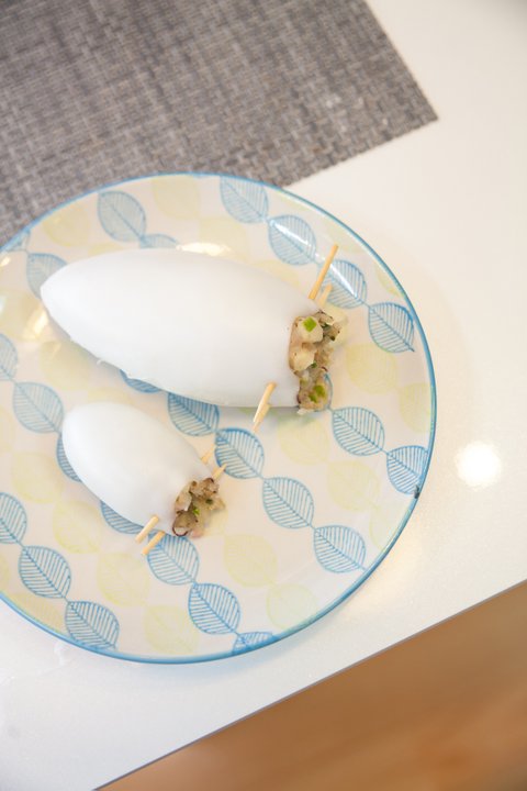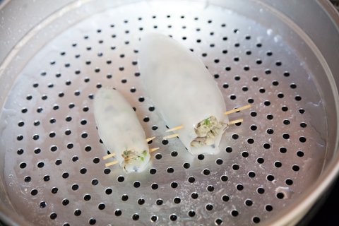 무늬오징어속 재료를 넣고 이쑤시게로 내용물이 나오지않게 꽂아두고 찜기에 쪄서