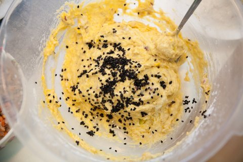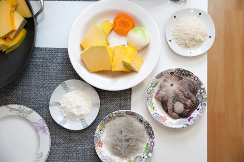 속재료:무늬오징어다리,두부약간,잡채약간,청양고추약간,양파반개,계란,밀가루,후추,소금,참기름,,깨소금