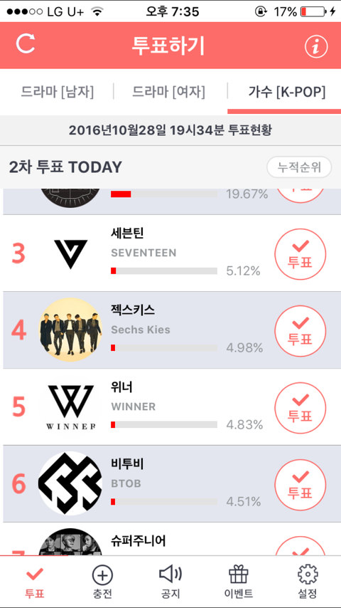 현재6위 2차누적 4위(안드뤄이드,사과폰에 어플 설치해야 투표가능 !)
