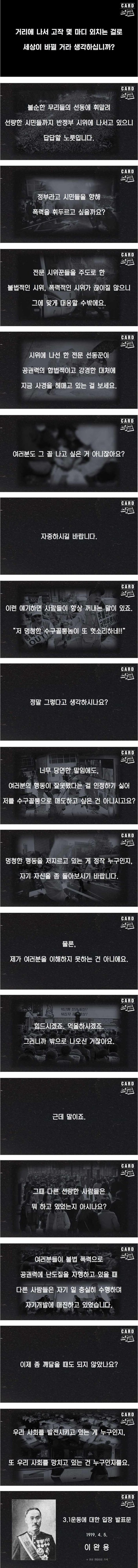 소요 당초에는 당국에서도 관대한 수단을 사용할 방책이오 또 조선인 측에서도 인민에 위험함이 없게 조처할 뜻을 당국에 진정하였으나 한 달여 된 금일에 이르러서는 당국에 대하여 다시 용훼容喙할 여지가 없도다. 근일 각 신문지상으로 제군도 이미 살핀 바와 같이 각처의 언론이 더욱 엄중하니 본인도 조선인이라 책임상으로든, 인정상으로든 그 위험이 눈앞에 임박함을 아는 이상에는 한마디 안 할 수가 없음이라. 매국적의 경고라하여 자신의 안위에까지 유관함을 듣지 않는 것은 생각없음이 심하지 않은가. → 해석 : 내가 매국노긴 해도 바른 말을 할 수도 있잖아?