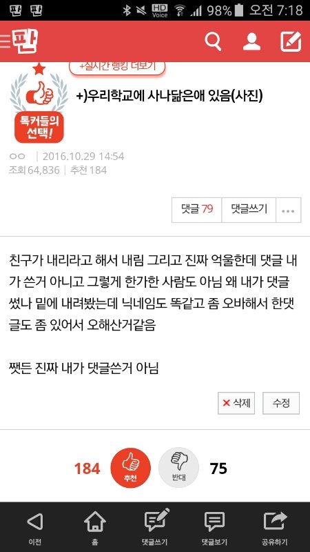 친구가 내리라고 해서 내림 그리고 진짜 억울한데 댓글 내가 쓴거 아니고 그렇게 한가한 사람도 아님 왜 내가 댓글 썼나 밑에 내려봤는데 닉네임도 똑같고 좀 오바해서 한댓글도 좀 있어서 오해산거같음