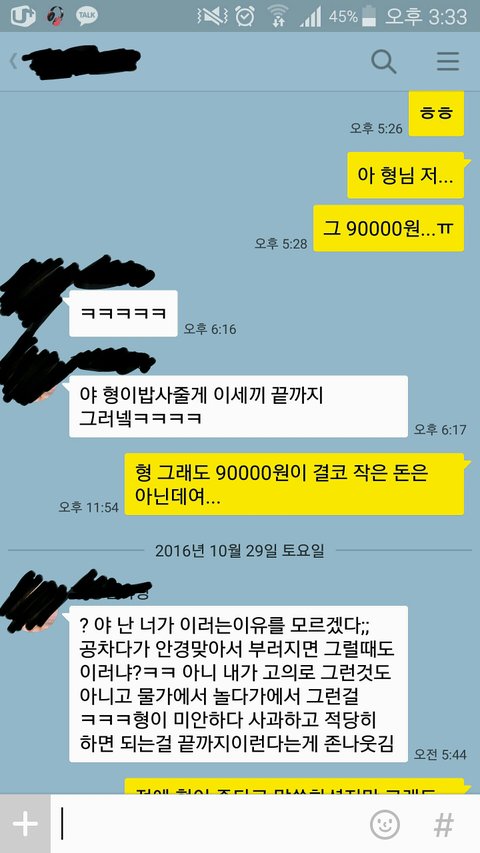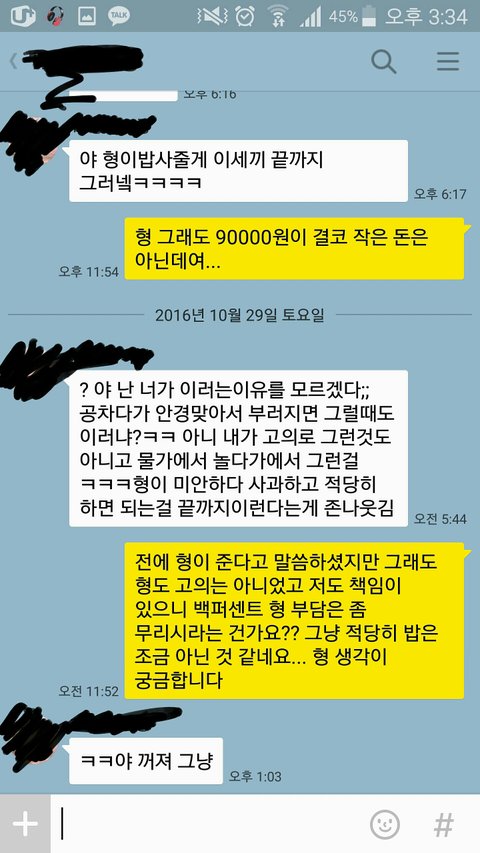 여름방학을 하고 MT로 계곡으로 같이 놀러갔습니다 물놀이를 하러 물가에서 기다리고 있었는데 갑자기 저를 밀쳐서 물로 집어넣는거였습니다... 당시 저는 안경을 쓰고 있었던지라 갑자기 물에 빠지니까 안경이 떠내려가더라구요... 전날에 비도와서 계곡바닥은 보이지도 않았구요 미친듯이 찾아봤지만 안경은 찾을 수가 없었습니다 그래서 빡쳐서 형한테 안경 떠내려갔는데 가뜩이나 90000원짜린데 어떡할거냐고 물었죠 그러더니 내가 하나 사주겠다는거에요 아무것도 안보여서 빡치는데 하나 사줄게라거 하니까 내 기분은 안중에도 없나 싶었습니다 그냥 선배니까 참고 넘어갔습니다 안경값은 나중에 청구하라고 똑똑히 들었습니다.mt가 끝나고 바로 다비치로 가서 안경 하나 다시 구매하고 90000원 긁힌 영수증 사진찍어서 카톡으로 보내줬죠 7월 중에.일어났던 일이라 8월에 보내준다고 하는겁니다 그래서 기다렸는데 8월이 지나규 9월이 지나도 돈을 안갚는거에요 바로 어제 톡으로 이렇게 말했죠