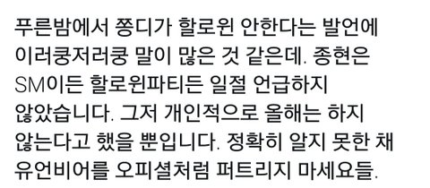 방금 샤이니 종현이 푸른밤(라디오)에서 얘기함 자세히 이유를 못들었지만 아마 지금 나라 상황도 그렇고 파티를 하고 말고할 상황은 아닌듯ㅇㅇ.. 올해는 없답니다 조금은 아쉽지만 옳은 결정 같다 sm과 직접적인 관련은 없대도 지금 상황이 파티할 상황은 아닌듯