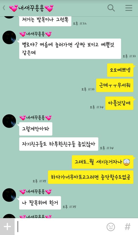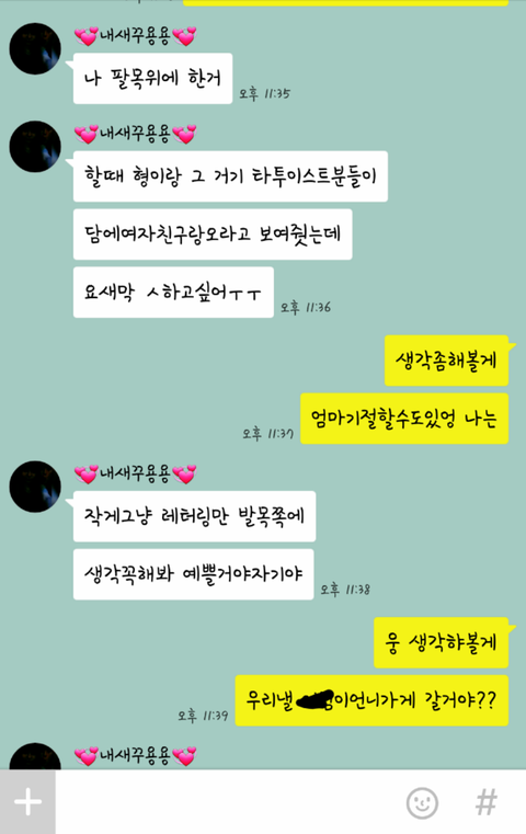 아까 집에서 남자친구와 카톡을 하던중에 손목 팔목 뒤통수아래?귀밑쪽? 에 타투를 한 사진들을 쭈욱 보내더라구요 그러면서 자기는 이런거 해보고싶다고 얘기를 꺼내던데..