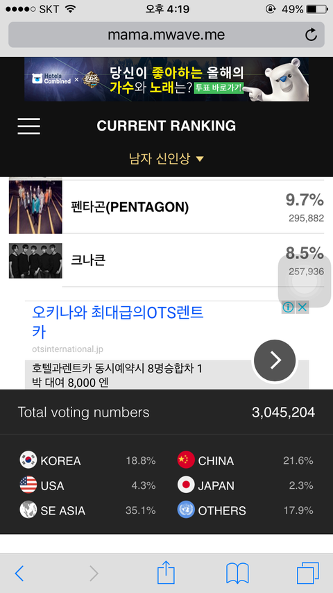 방탄은 북미 남미가 인기가 많아. 특히 남미..넘사벽 많음. 저번에 톡선에 뜬거 본 이삐들은 알거야. 내가 링크 찾으면 추가할게. 근데 그분들이..투표율이..ㅠ