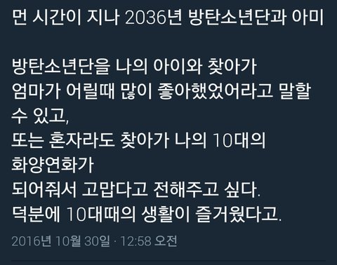 방탄은 뭔가 그래. 그저 노래 잘하는 잘생긴 가수 정도가 아닌 우리들의 우상. 시간이 흘러도 우릴 아껴준만큼 우리또한 아껴야할 사람. 그런 존재야 방탄이.