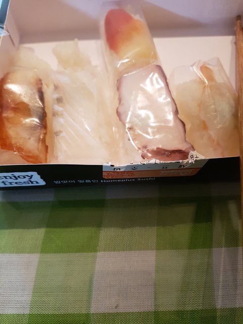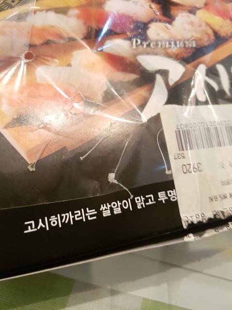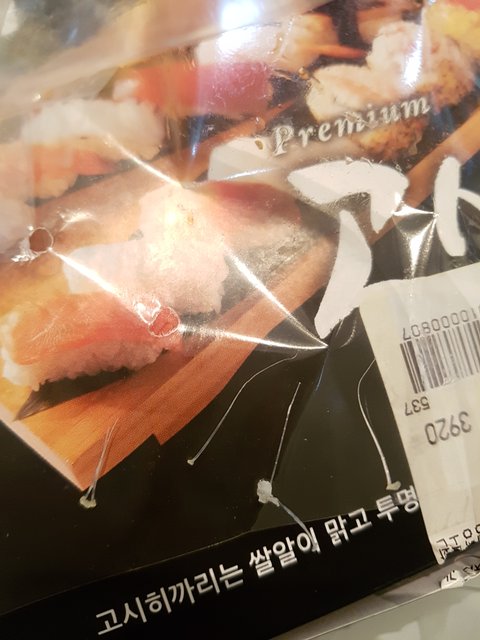 늦은 시간인지라 마감 세일을 하고 초밥판매원 아주머니가 10개에 3900원이라길래 장어 2개를 섞어서 사왔는데 이게 문제였네요.