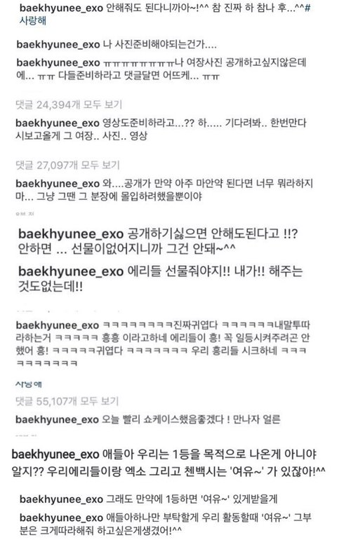 마지막으로 데뷔하자마자 차트 싹쓸이 해서 신난 백현임ㅋㅋㅋㄱㅋ 공약으로 vcr에 나왔던 여장사진을 올리기로 했는데 진짜 차트 올킬 되니까 기분 좋아보임ㅋㅋㅋㅋㅋ귀엽닼ㅋㄱㄱㄱㅋㅋ