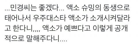 깔깔깔....이보다 더 부러울 순 없다 민경사마 핵부러움 얼마나 예쁘면 액소가 소개시켜달라 할 정도임? 진짜 현타...늘 오던 현타+개 부러움...하하하하하하하핳하ㅏ하ㅏㅏ하하핳^^덕질 그만하고 싶은데 우민이 얼굴 볼 때마다 내 손은 나 몰래 이미지를 다운하고 있어^^