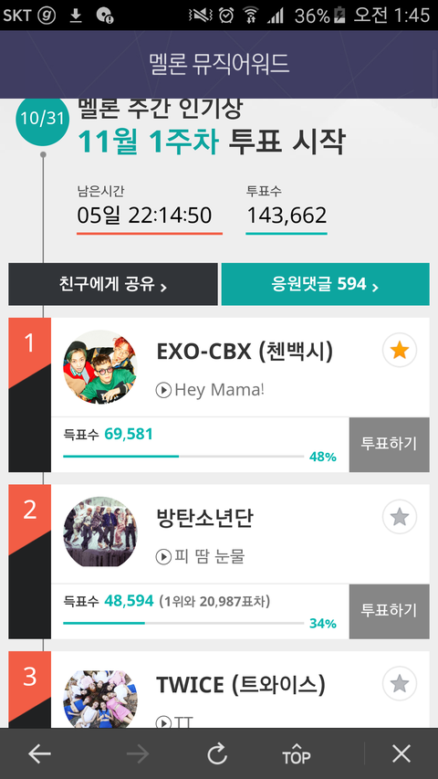 멜46뮤 주간인기상에 첸백시떴대