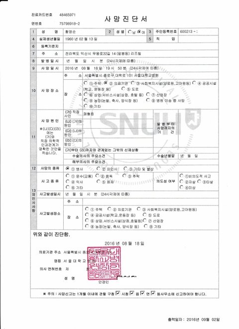 하지만 서울대학교 병원에서는 사망진단서에 외인사가 아닌 병사로 체크를 하였고,