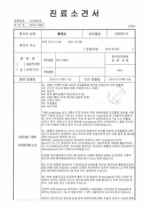 그렇게 방치를 해서 결국 저희 어머님께서는 어께에 다시 염증이 생기고 그 염증이 심해서