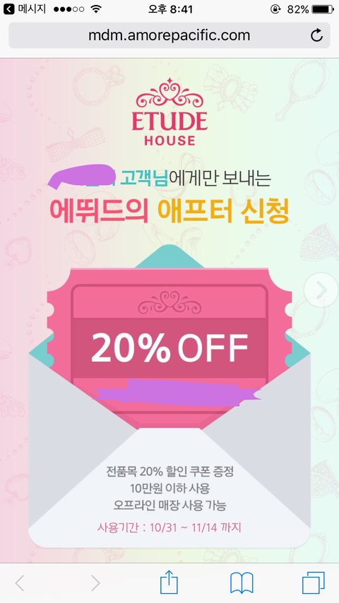 내가 몇일전에 에뛰드에 회원가입을 했더니 20%할인쿠폰을 받았단 말이야 그런데 이거 사용 어떻게 해?