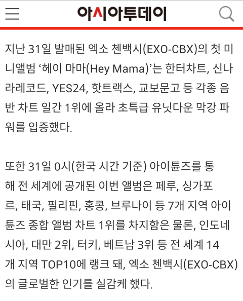 엑소 첸백시, 첫 미니앨범 ‘Hey Mama!’ 아이튠즈 종합 앨범 차트 1위