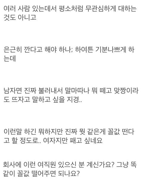 남직원이 무표정이면 별말안하는데 여직원이 무표정이면 지랄하는 남자들 꼭 있음