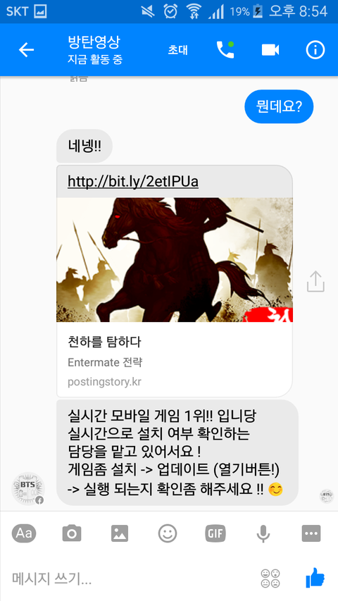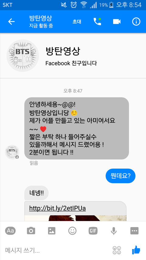 아니 갑자기 방탄영상이라는 사람한테 친구신청이 와서 받았었는데 오늘 갑자기 메신저가 왔길래 봤는데