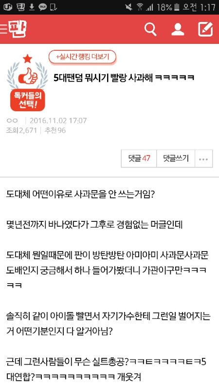 어제? 빅스팬들이사과문올린걸 톡선에서봤어요 댓글들도 훈훈하고 잘풀어지는거같아서 보는제가엄청뿌듯했어요 근데 톡선에 이런글이또올라와서 아미분들이팬코했다고 또욕먹고있네요 저글에 절대추천누르지마세요 방탄팬들너무안쓰럽네요 이때다싶어서 다시우르르몰려서까는느낌..?