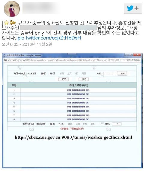 밑에는 큐브가 상표권 등록과 신청했다는 제보가 있어