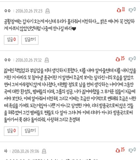 이제 곡나오면 뮤비랑 서양수박 스밍 빡세게 돌려야 하는데 보면서 힘날수 있게 감동이었거나 감사했던 댓글들 써보자ㅎㅎ(귀찮으면..어쩔수..없지......) 개인적으로 난 타팬분들이 비엡삐 노래 좋다고 해주실때가 가장 좋드라ㅠㅠ 아 그리고 진심으로 애들 걱정하고 좋아해주는 거 티나는 베이비들 댓글도 좋았음...♥