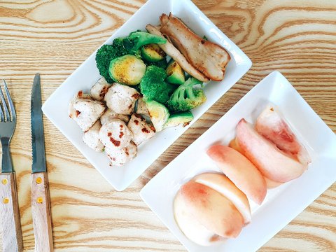 이건 주말 아점으로 복숭아랑 닭가슴살볼, 미니양배추, 새송이버섯을 구운거예요