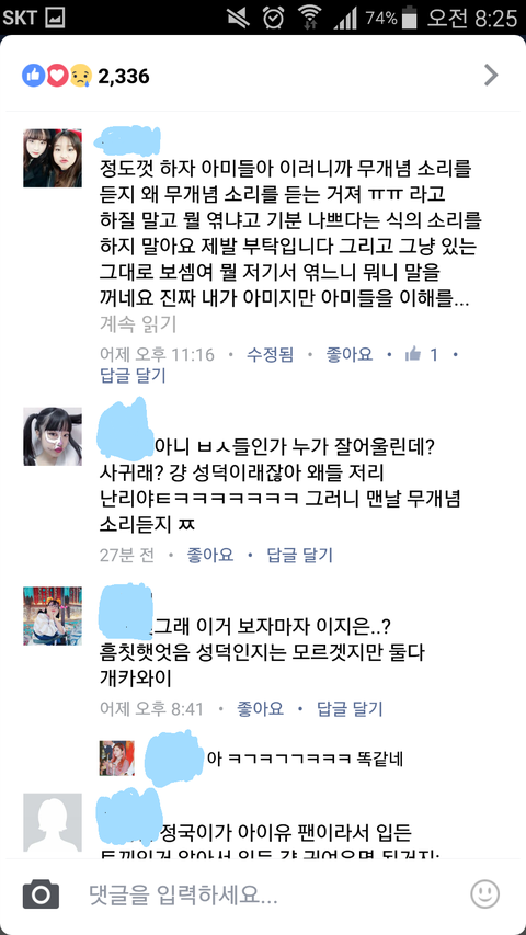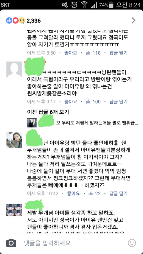 정국이 아1이유분팬인거 우리 팬들 중에서 모르는사람은 없겠지 근데 정국이는 아1이유좋아한다는둥 이런 댓글 자제 좀 해라;;;아1이유분 지금 남친도 있으시고 남친있는여자한테 우리 누구는 누구 좋아하거든,이상형이거든 이러는거 별로야 발없는말이 천리간다고 아1이유분도 SNS하실텐데 이런거보시고 무슨 생각드시겠니?팬이라고 하면은 뿌듯해하시겠지만 좋아한다,이상형이다 이런얘기 들으시면 난 뿌듯해하지는않으실거같은데 남친도 있으신데 그리고 얼굴책에 몇몇 아미들도 기분나쁘다해서 우리 무개념소리 듣고있고 아1이유팬분들도 별로 안 좋아하시고 난 나쁘단게아니라 자제 좀 해달라고 남친도 있으신분한테 누구는 누구 좋아한대 이런댓글 달지말고 내가 한두번봤으면 이런말 안하지 ㅌㅅ에 여자연예인이랑 엮는글이면 정국이는 아1이유좋아하거든 이댓글을 수도 없이 봐서 그래 그리고 아미들도 ㅌㅅ에 여자연예인이랑 엮는글 보기 싫잖아 자꾸 ㅌㅅ에 저런댓글쓰면 안티들이 물고 늘어져서 나중에 아1이유분이랑 사귄다는글 올라올거야 그러길바라니?
