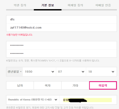 이메일 쓰고 번호 빼고는 아무거나 써재꼈어 성별은 미입력으로!
