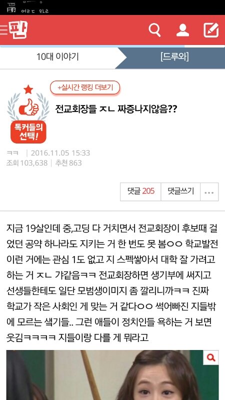 치마조카길진않고 화장도좀하는데 댓글에 우리전교회장은 치마짧고 화장한다고까는거봐서 개찔림 진짜짜증나네 전교회장되면 치마도늘리고 생얼로다녀야되나 화장도 거의안하는수준인데