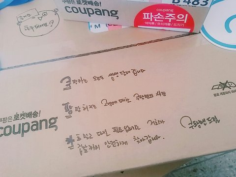 우리집도 저렇게 와ㅛ었는데 작지만 엄청 기분좋더라ㅋㅋㅋ 택배기사분들 화내시는분들도많으신데 저렇게 주시니까 쿠팡맨짱