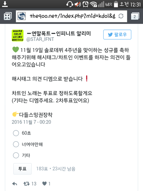 이벤트하네 스밍권가지고있는토기들많아야하는데 19일이면ㅠㅠ딱끊길때아니냐.....제발 연말까지돌랴줘 인슾들ㅠㅠ지켜줘ㅠㅠ한시차트너무무서워ㅠㅠㅠㅠㅠㅠㅠㅠㅠㅠㅠ스밍확인하자ㅠㅠ